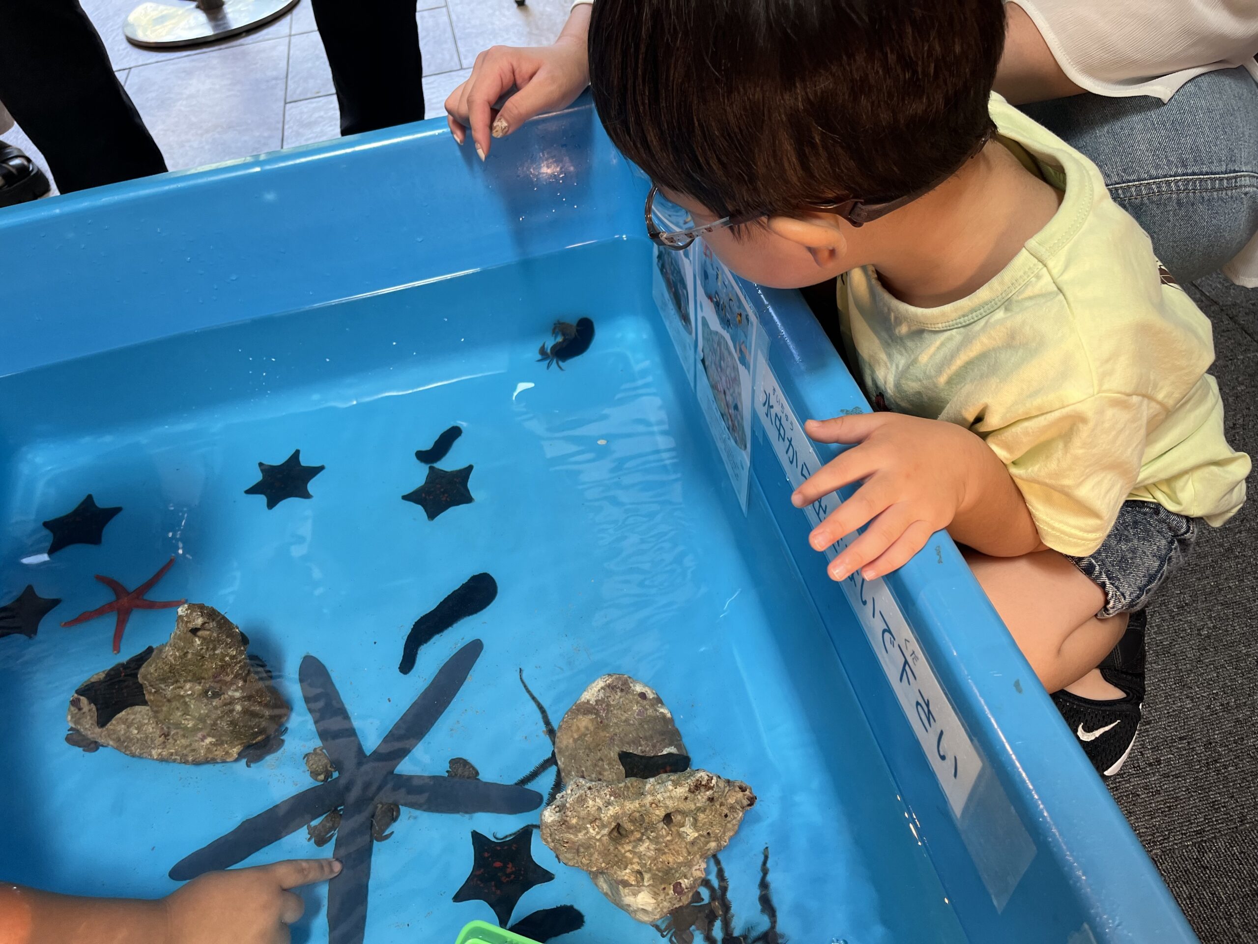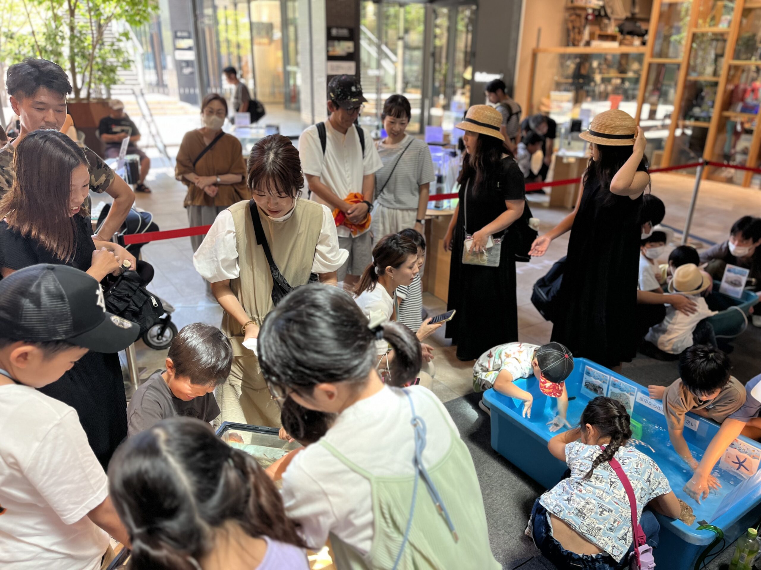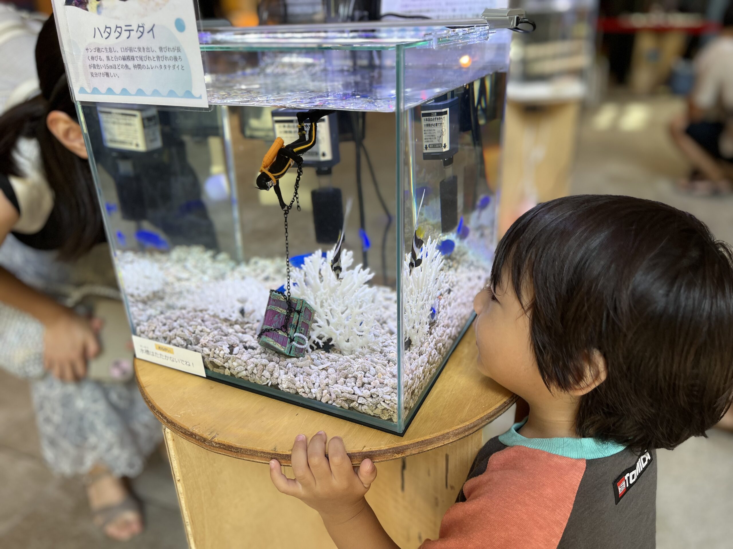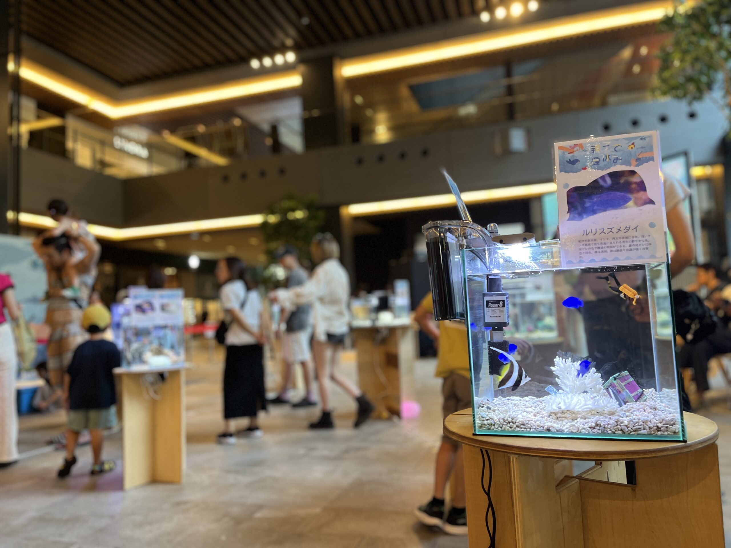夏休み真っ只中の8月9日〜8月12日、計4日間にわたりたくさんの方にお越しいただけました。綺麗な水槽展示はもちろん、小さなお子様でもお楽しみいただけるタッチングコーナーも設けてありドクターフィッシュや、海の生き物とふれあってもらいとても楽しんでおられました。海の生き物コーナーでは、ナマコやヒトデ、普段あまり生きている姿を見ない伊勢エビ、大型のカブトガニなど珍しいの生き物たちがいて子供たちがドキドキわくわくしながら触れ合っていました!大人の顔ほどあるカブトガニはみなさん驚かれていましたね!伊勢エビも食べる時の姿と生きている姿を比べていらっしゃった方もおられました。展示されている水槽でもカクレクマノミやハリセンボン・チンアナゴ・ハナヒゲウツボ・シマサメ・クラゲなど様々な種類のお魚をご覧いただけました。夏の暑い日に少しでも涼しげな空間を体験して貰えたかと思います。