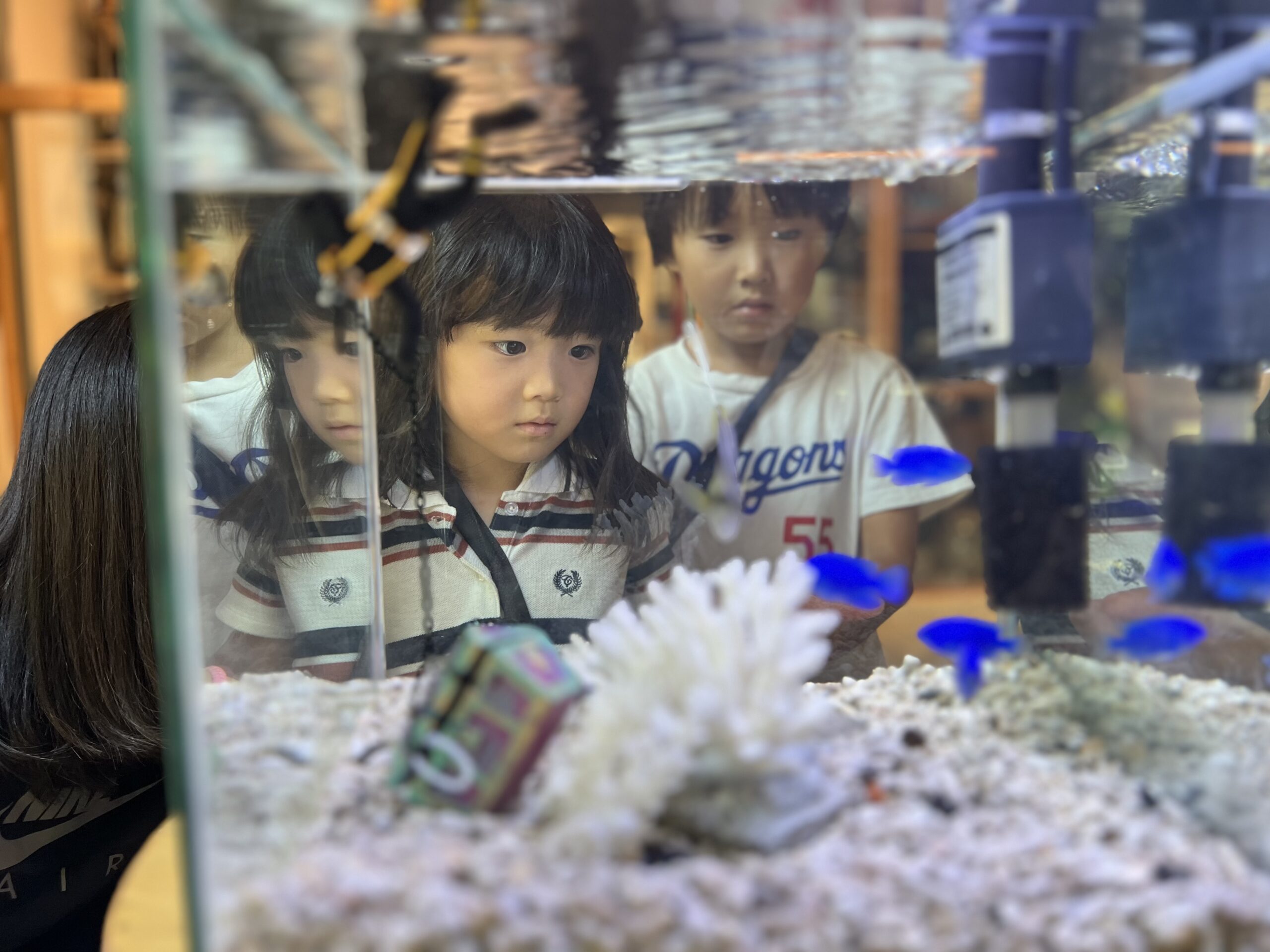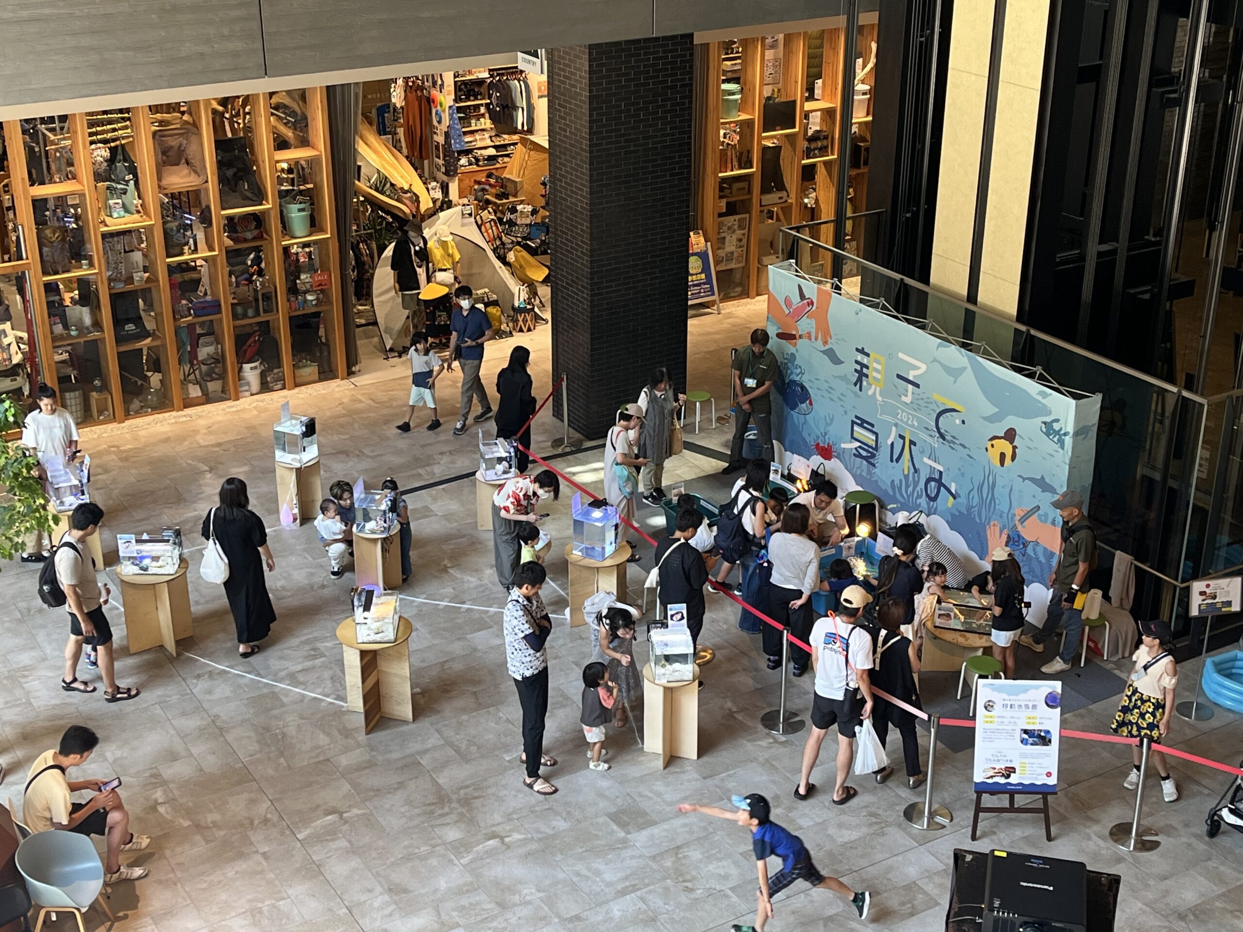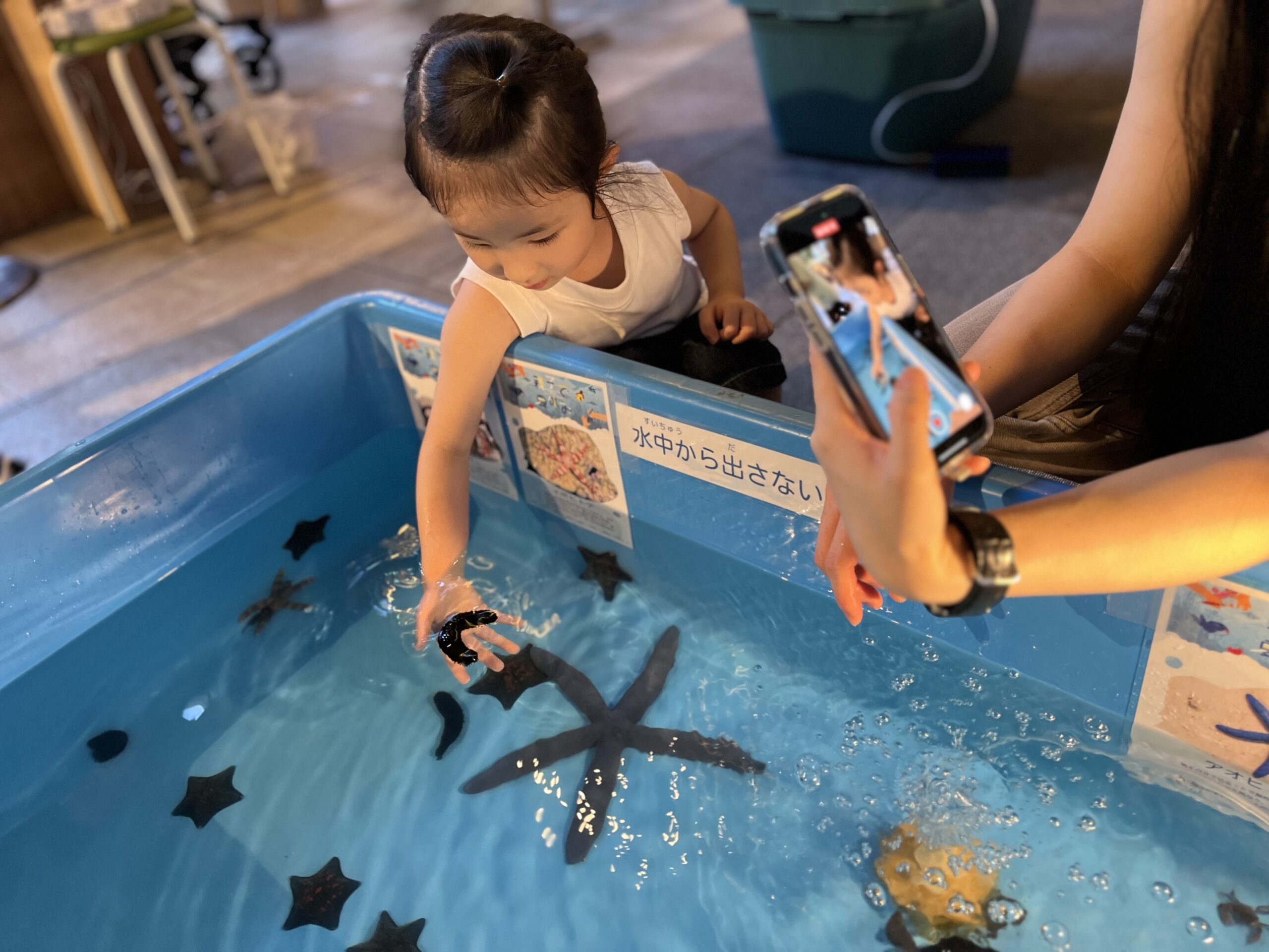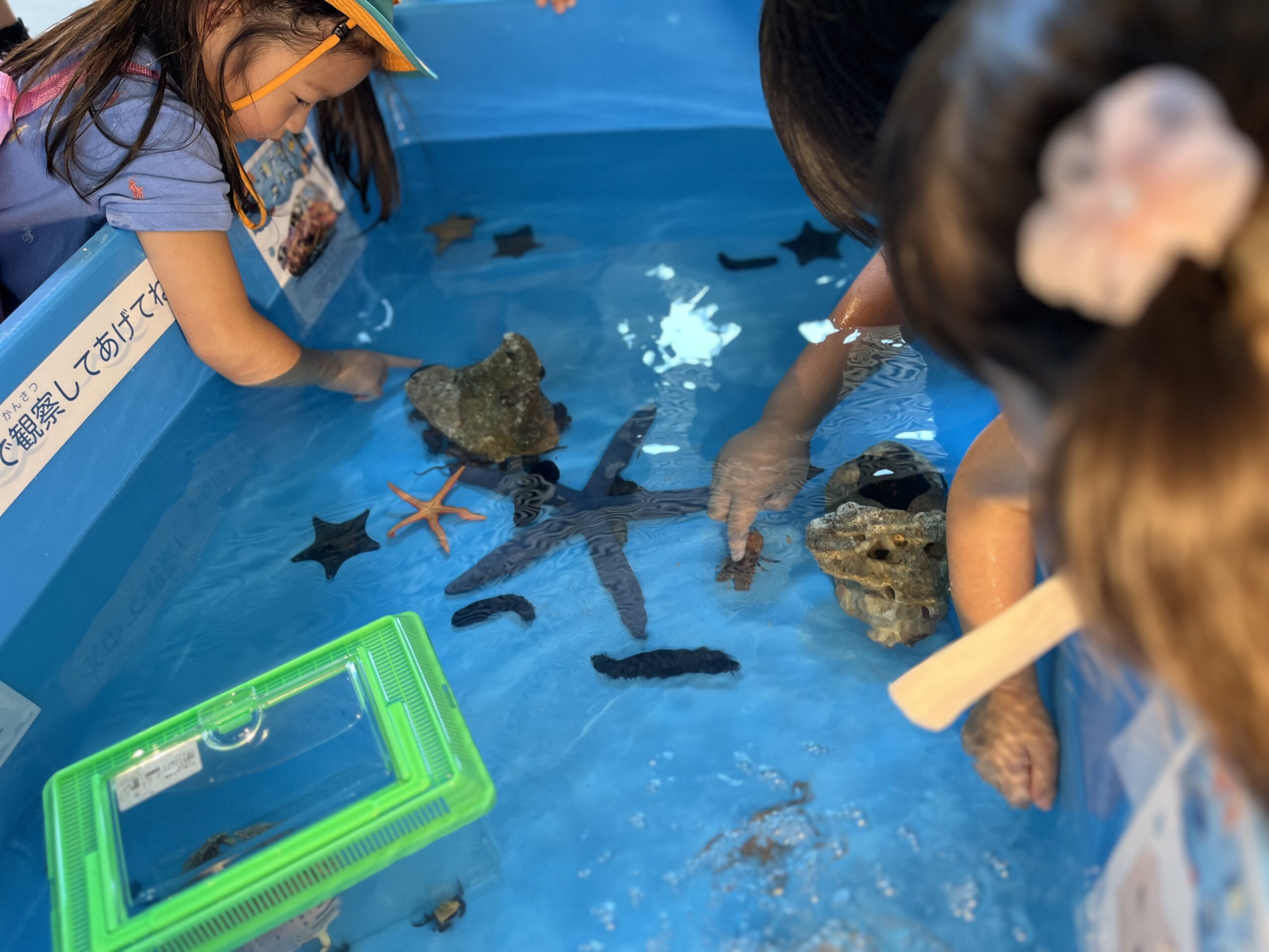 夏休み真っ只中の8月9日〜8月12日、計4日間にわたりたくさんの方にお越しいただけました。綺麗な水槽展示はもちろん、小さなお子様でもお楽しみいただけるタッチングコーナーも設けてありドクターフィッシュや、海の生き物とふれあってもらいとても楽しんでおられました。海の生き物コーナーでは、ナマコやヒトデ、普段あまり生きている姿を見ない伊勢エビ、大型のカブトガニなど珍しいの生き物たちがいて子供たちがドキドキわくわくしながら触れ合っていました!大人の顔ほどあるカブトガニはみなさん驚かれていましたね!伊勢エビも食べる時の姿と生きている姿を比べていらっしゃった方もおられました。展示されている水槽でもカクレクマノミやハリセンボン・チンアナゴ・ハナヒゲウツボ・シマサメ・クラゲなど様々な種類のお魚をご覧いただけました。夏の暑い日に少しでも涼しげな空間を体験して貰えたかと思います。