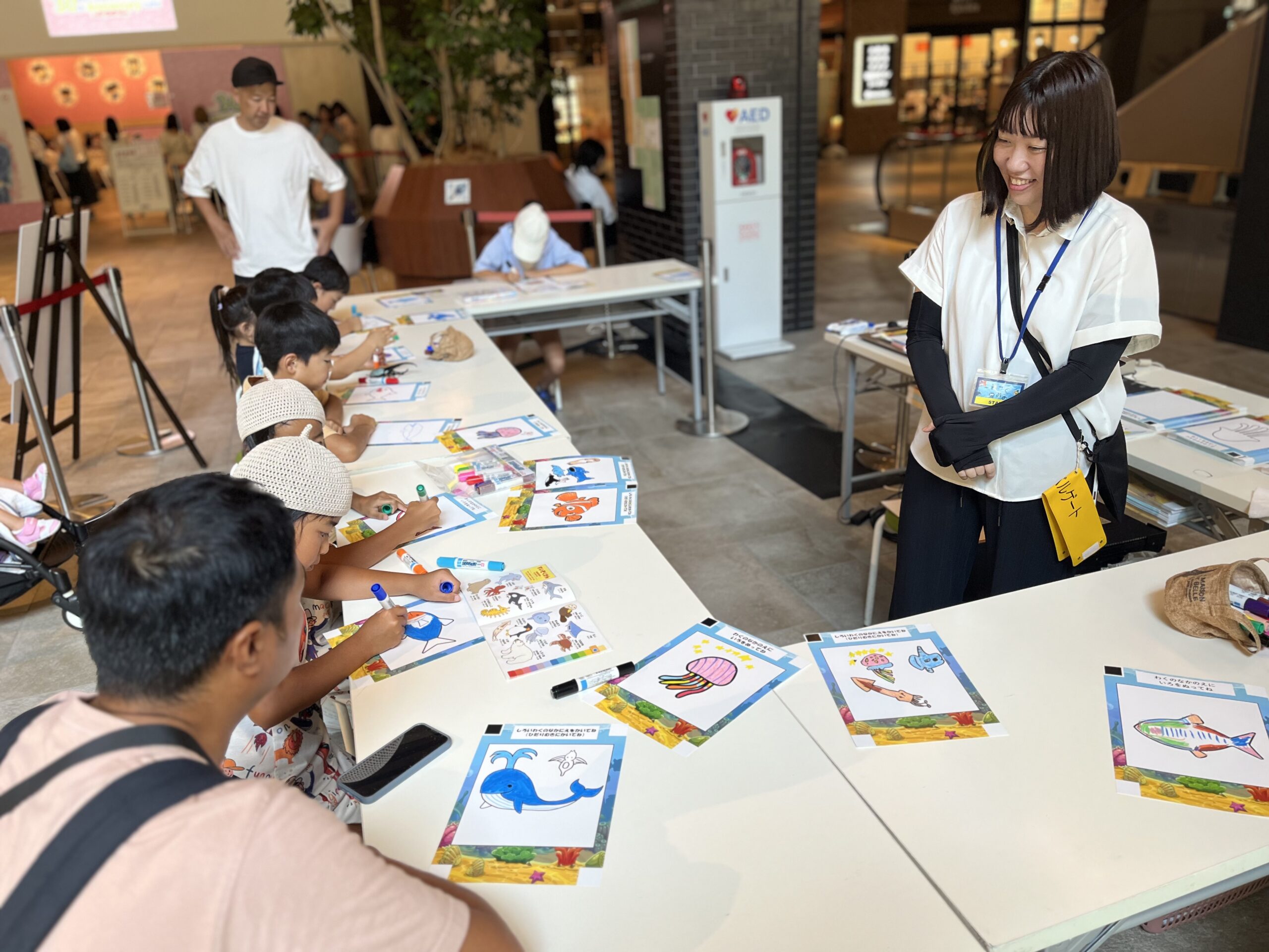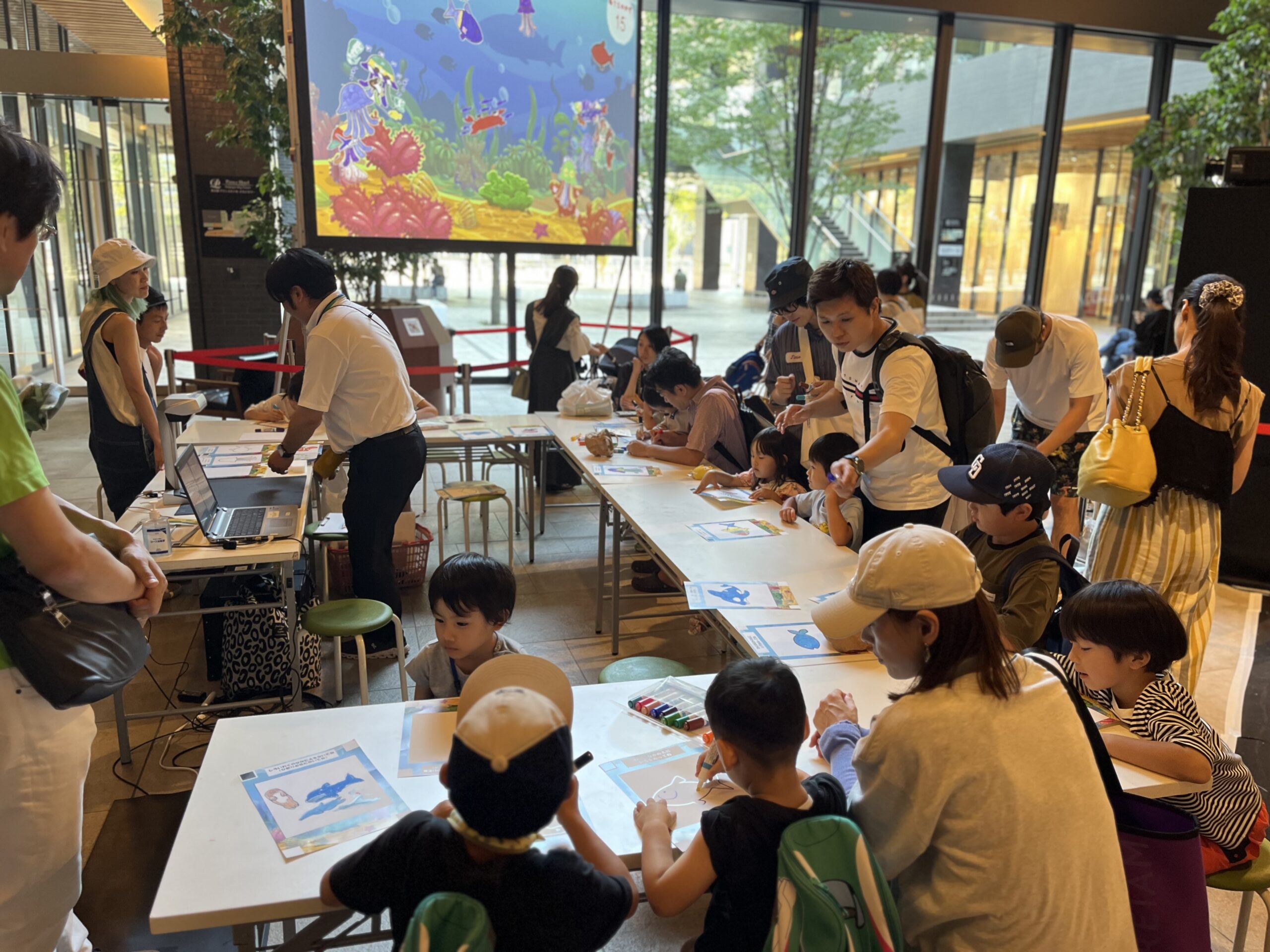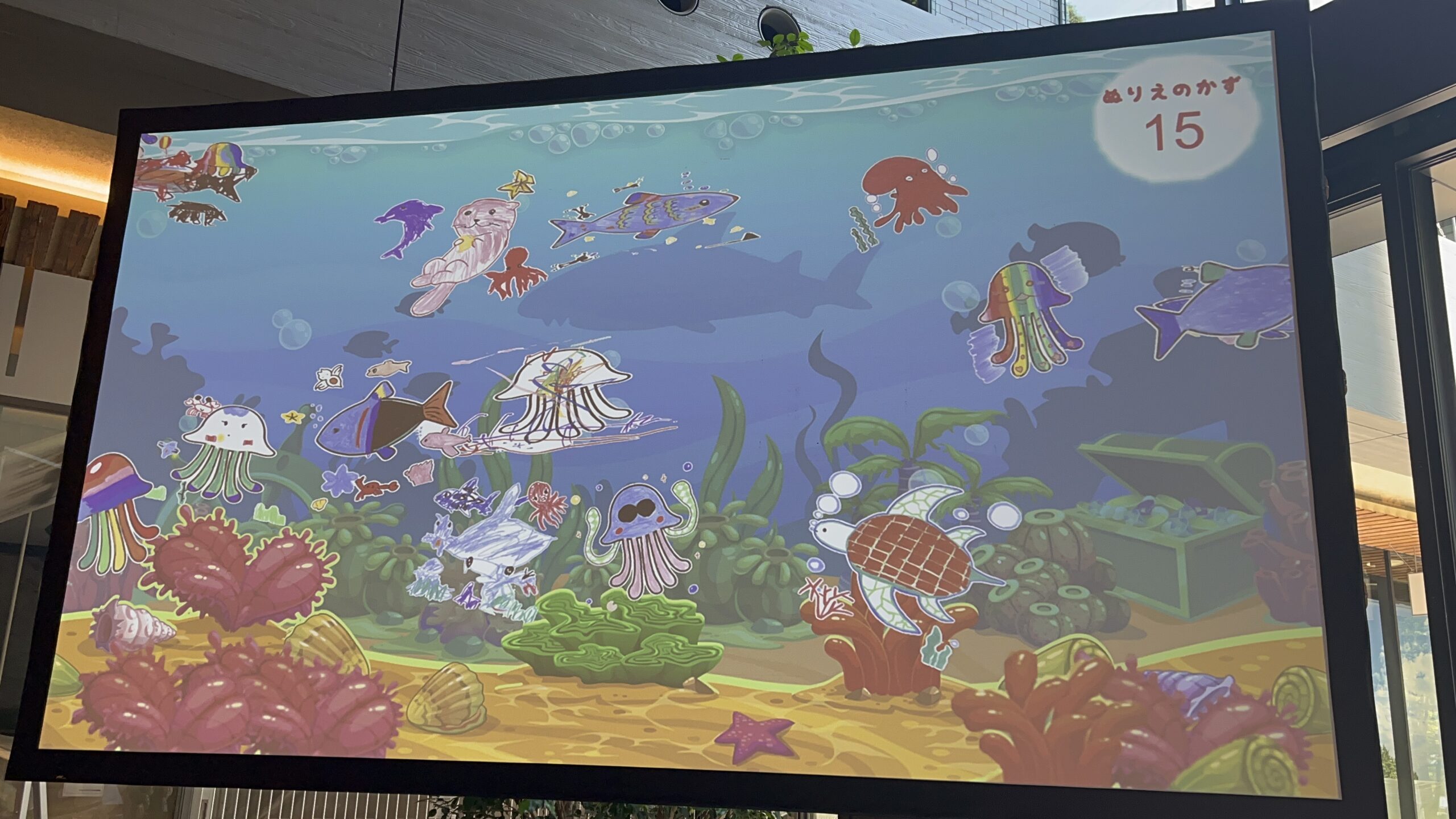 また今回は、同時開催でデジタル水族館のご採用もいただきました。デジタル水族館ではお絵描きや、ぬり絵をした絵がモニターの中を泳ぎだします!ぬり絵の用紙もご用意しましたのでちいさなお子様でも楽しんでいただけました。自分の書いた絵が泳ぎ出すと探して写真を撮ったり記念撮影などもしていただいていましたね!このように移動水族館だけではなくデジタル水族館をあわせてトータルでのご提案が可能ですのでいつでもご相談ください!